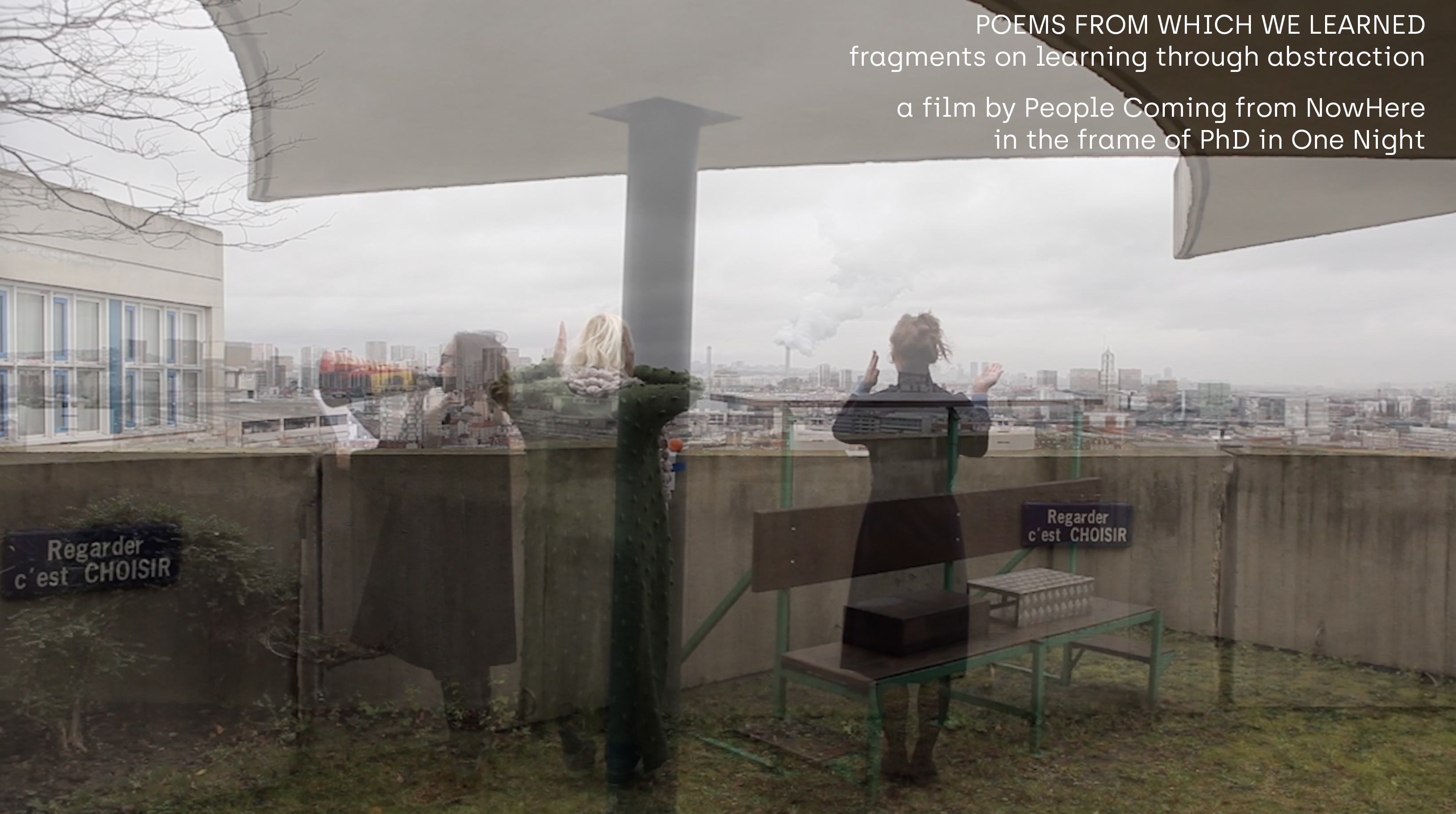Doing things with other people is hard, though of course so is doing things alone. Both might be impossible if they were not in the end inseparable. The hardest part might be to start, which means to get beyond the contradiction and finding people with whom we can work alone, with whom we can learn how to be separable and inseparable. Poems from which we learned is a document of this kind of process but it is also clearly more. It’s a score as well as a performance, played but also playable. The film gathers the results of PhD in one night, a frame for activity—talking, acting, teaching and learning—that began in 2008. This framing might at first appear a little off, not because a contribution to the total of human knowledge that a PhD requires can’t happen in an in instant, but because what we watch in the film is a much longer, slower, ten-year process. Cutting together those ten years of conversation, experimentation and improvisation into just an hour does not change that slowness, and it does not compress this time. What it does is string together the moments—and fragments of moments—presenting them as examples, each one complete, of learning from the poems that these moments produced, learning each other and from ourselves. This poetry of moments is not one of epiphanies, it is built from moments of response.
